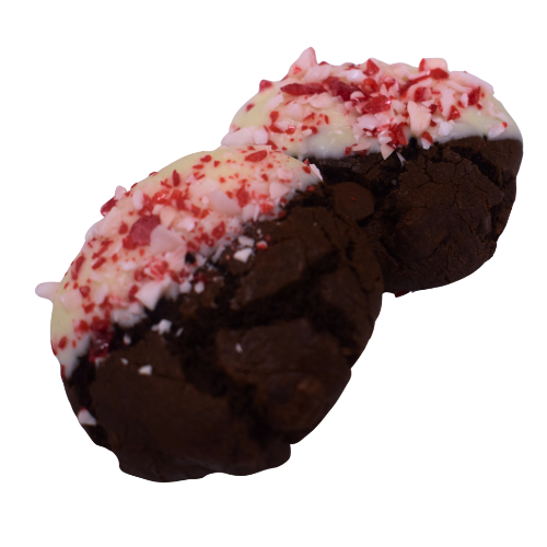 flour, semi-sweet chocolate chips, white chocolate, butter, sugar, brown sugar, cocoa powder, eggs, candy canes, espresso powder, vanilla extract, peppermint extract, baking soda, salt